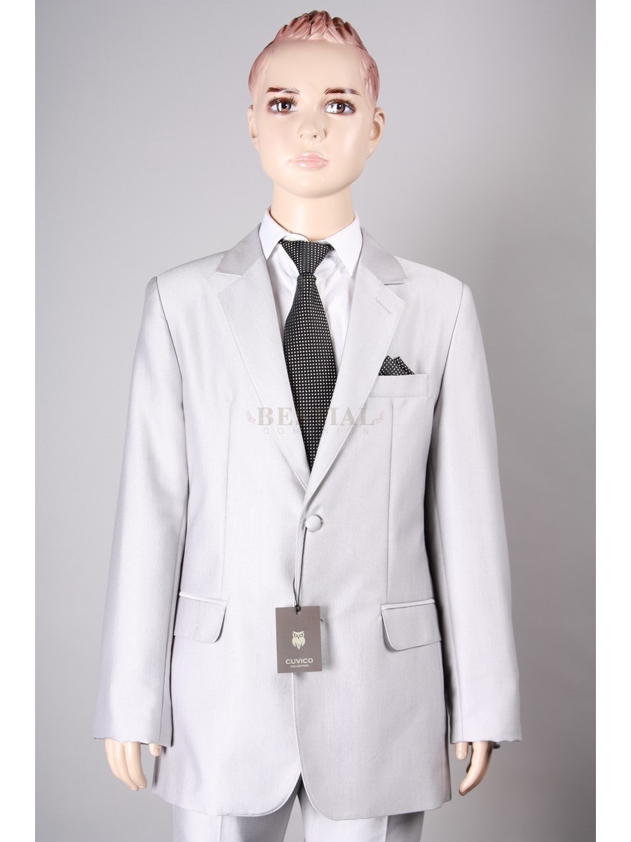 Traje De Comuniòn Cuvico Mod IT22 Elegante y con clase se presenta este moderno traje de calle para comuniòn de niño compuesto por cuatro piezas: . Americana de color gris plata con con pañuelo en azul marino . . Pantalòn de vestir a juego con la chaqueta. . Corbata en azul marino. . Camisa en blanco roto .
