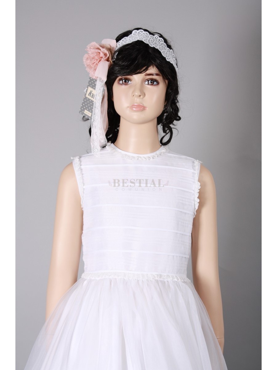 Vestido sin mangas con cuerpo elegante combinado en jaretas y un fino cinturòn en puntilla rizada. El vestido lleva una preciosa chaqueta con manga corta combinando con el elegante vestido.