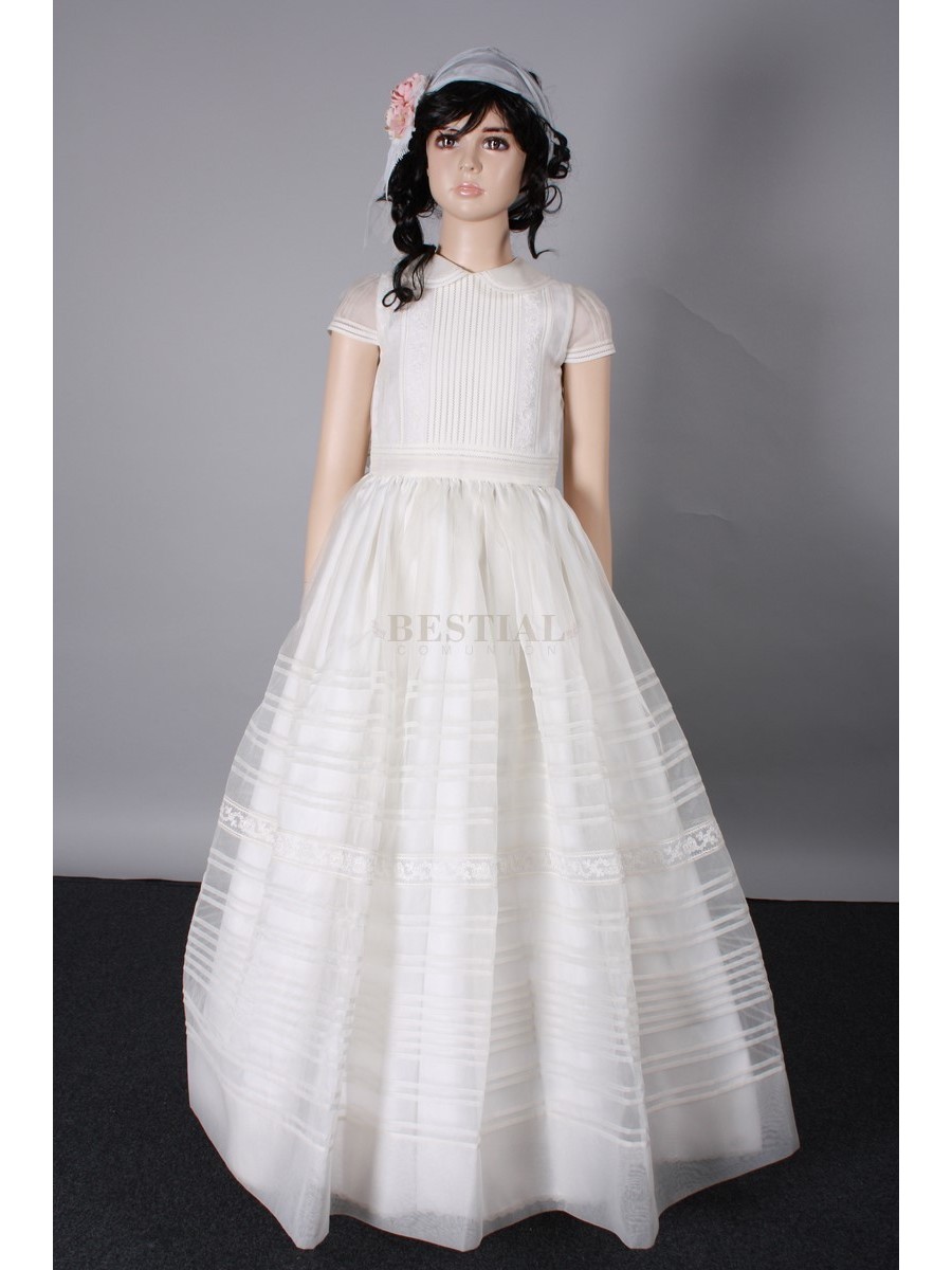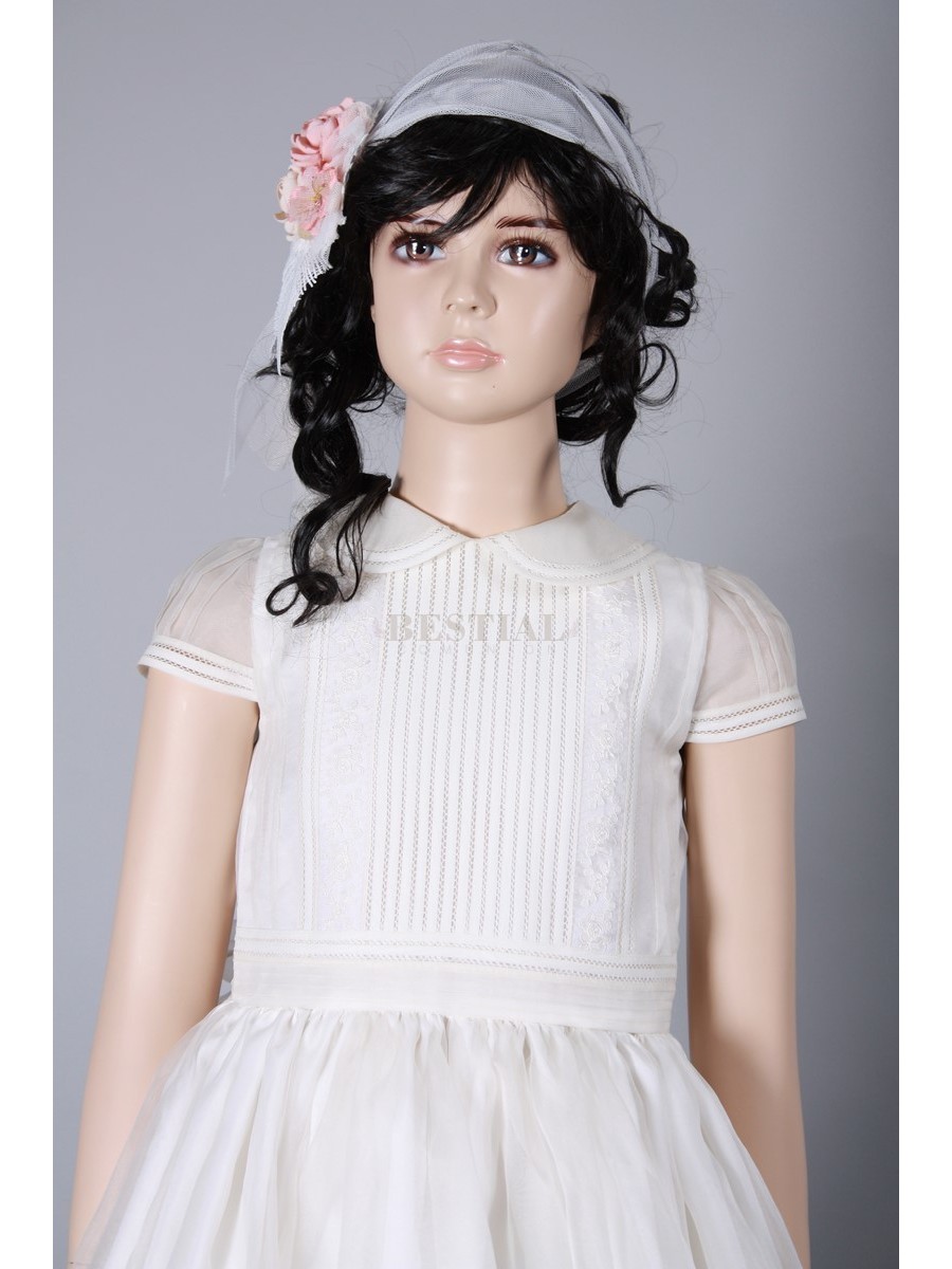 Vestido de comuniòn con cuello bebe y cuerpo en vainicas con puntilla.