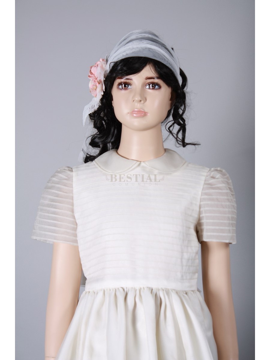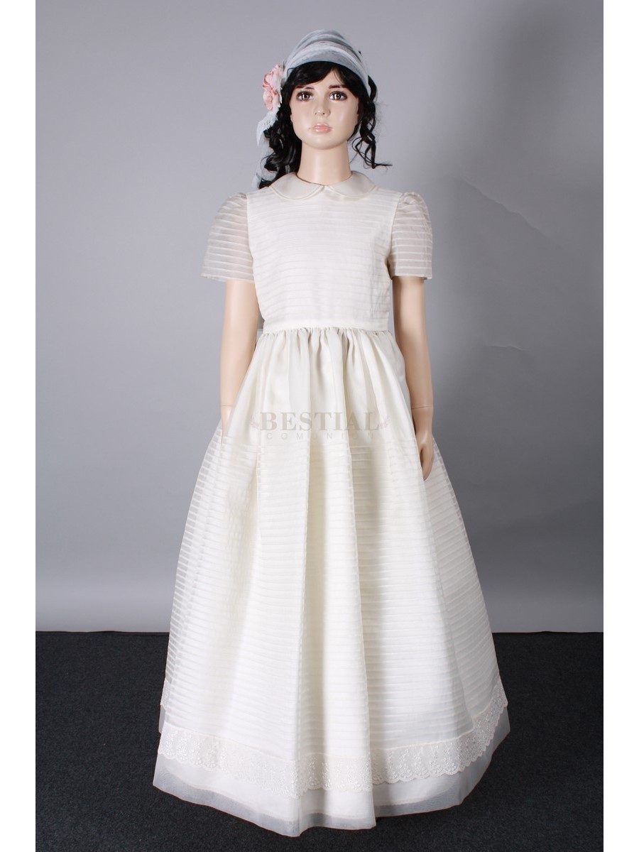 Vestido Comunión Bestial Mod B26 Vestido cuello bebe y cuerpo formado en jaretas finas haciendo juego con las mangas del vestido. Falda en finas jaretas terminando con una elegante puntilla.