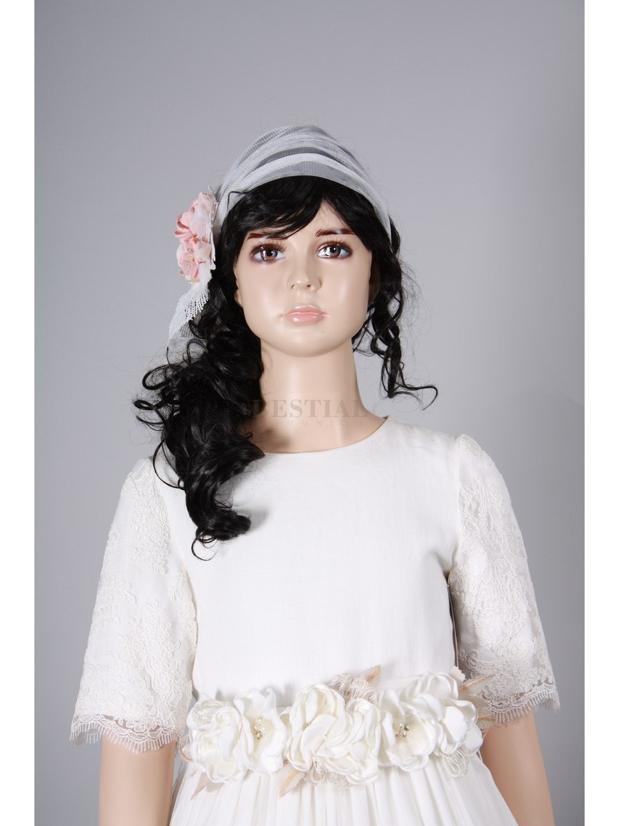 Precioso vestido de comunión con cuerpo en tejido lino, mangas con puntilla al codo, un precio bajín con grandes flores y falda en tul terminando con una gran puntilla.