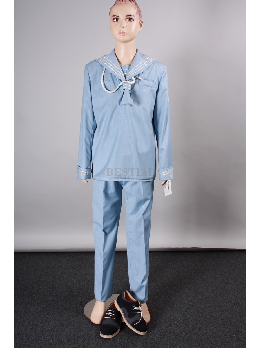 Traje Marinero Amaretto Mod 9020262 Traje marinero en color azul cielo con peto en color azul con tres nervios al contraste en el peto y los puños. Escudo bordado en la manga. Traje formado por dos piezas: casaca y pantalòn.