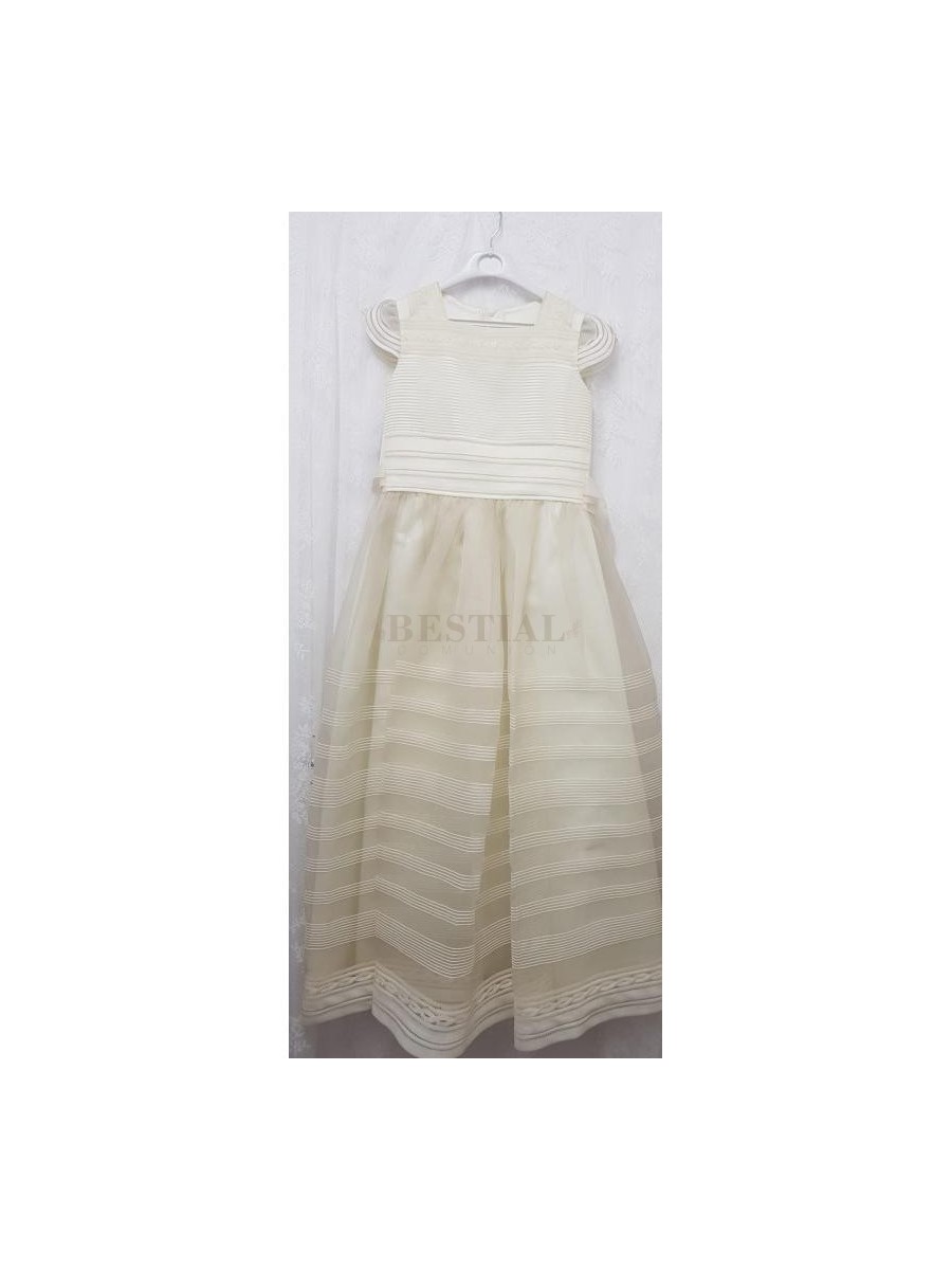 Vestido de Comuniòn. Precioso vestido de comuniòn cuerpo plisado en horizontal con una bonica puntilla que decora el cuerpoy vainicas, con cuello caja. Mangas cortas con vainicas. Preciosa falda con vainicas en horizontal que adorna la falda.