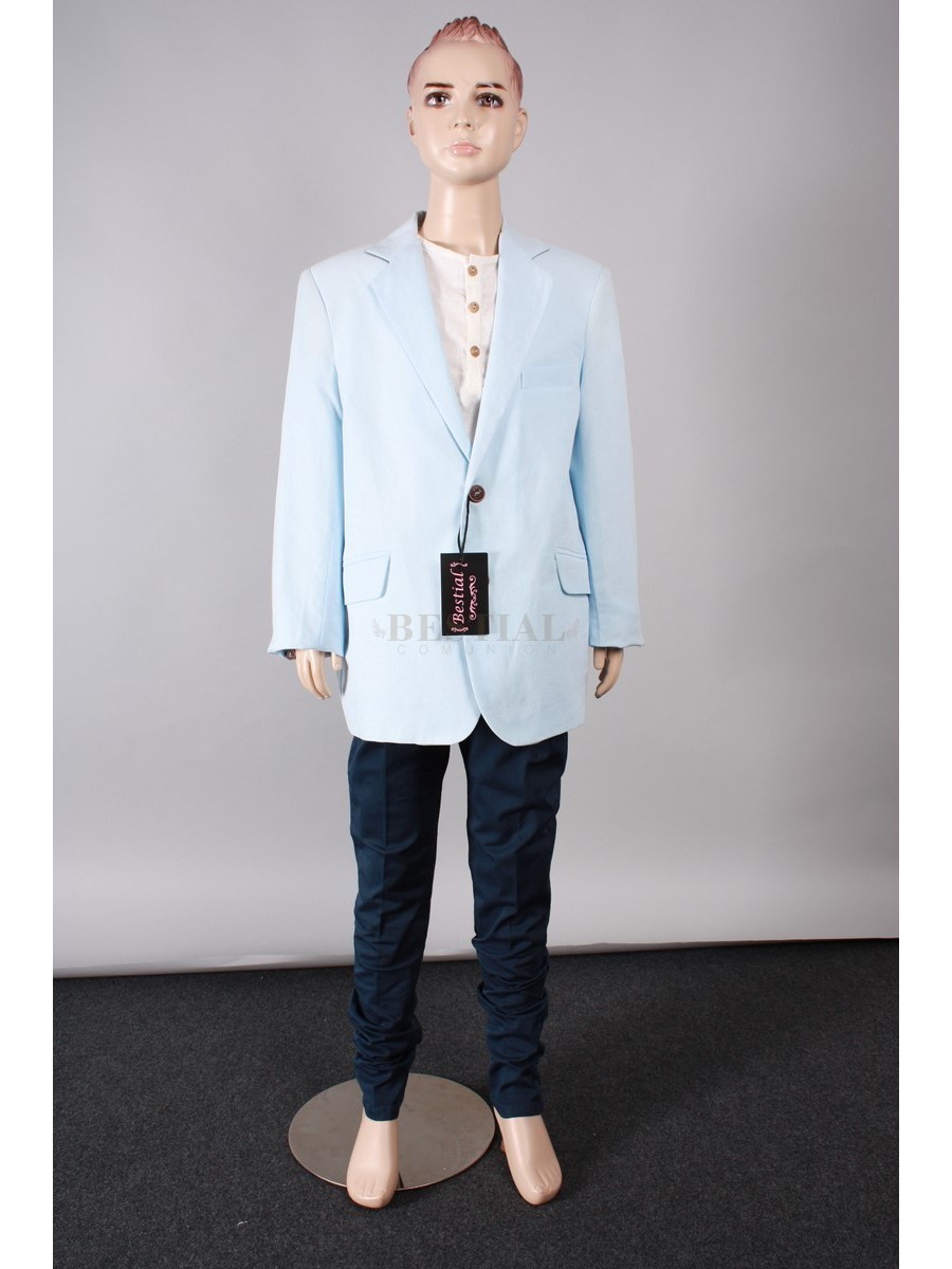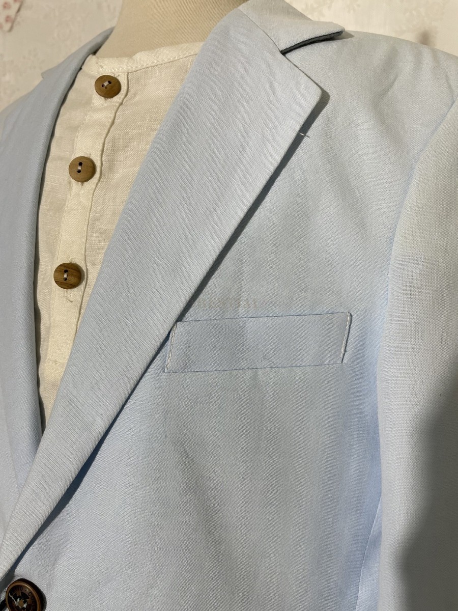 Traje de comuniòn niño chaqueta con solapa en lino color azul cielo, lleva la corbata haciendo juego con la chaqueta y un pantalòn color azul marino esport.