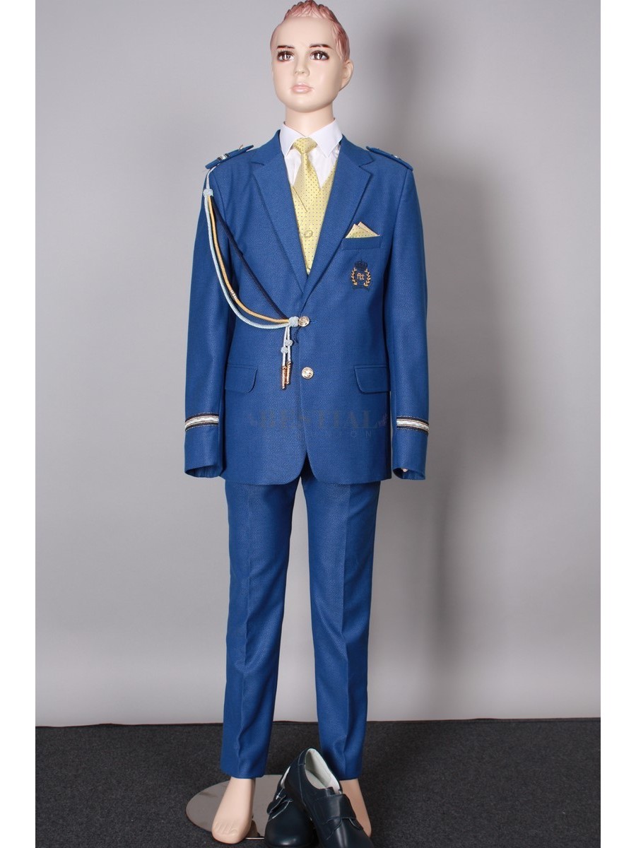 Traje almirante en color azul electrico con pañuelo en color amarillo y galones haciendo juego con la chaqueta, escudo bordado en color amarillo.