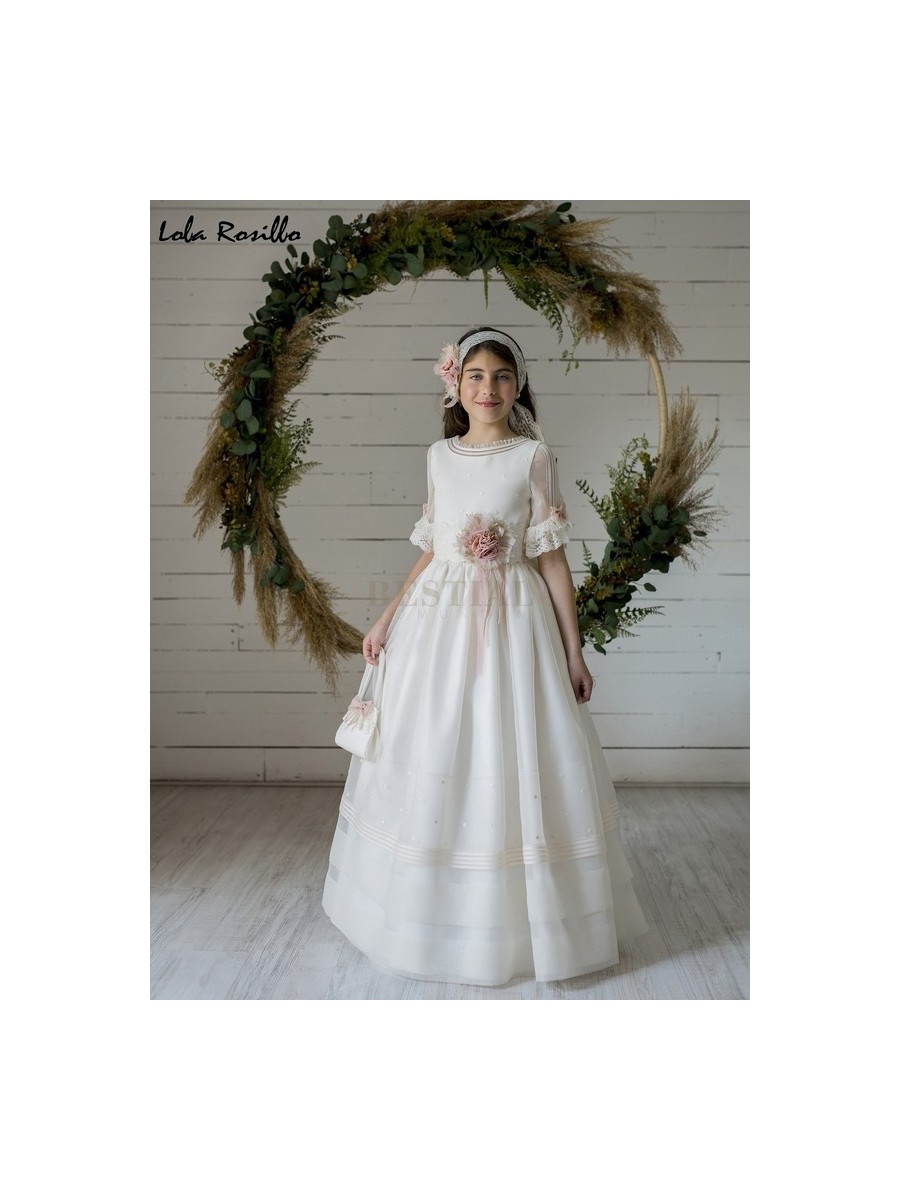 Vestido de Comuniòn Lola Rosillo Q425. Precioso vestido con cuello barca en vainicas y con tul transparente en el cuello. Cuerpo en organza plumeti y mangas en gasa transparente con vainicas y terminado con dos preciosas puntillas y un bonito lazo en rosa palo. Precioso fajin en puntilla ancha con una bonita flor grande en tonos destacando el precioso cuerpo. Falda pronunciando una caida vaporosa y alzando una falda princesa con mucho aire y movimiento. Este vestido lleva un turbante el cual va a juego con el vestido y se vende por separado.