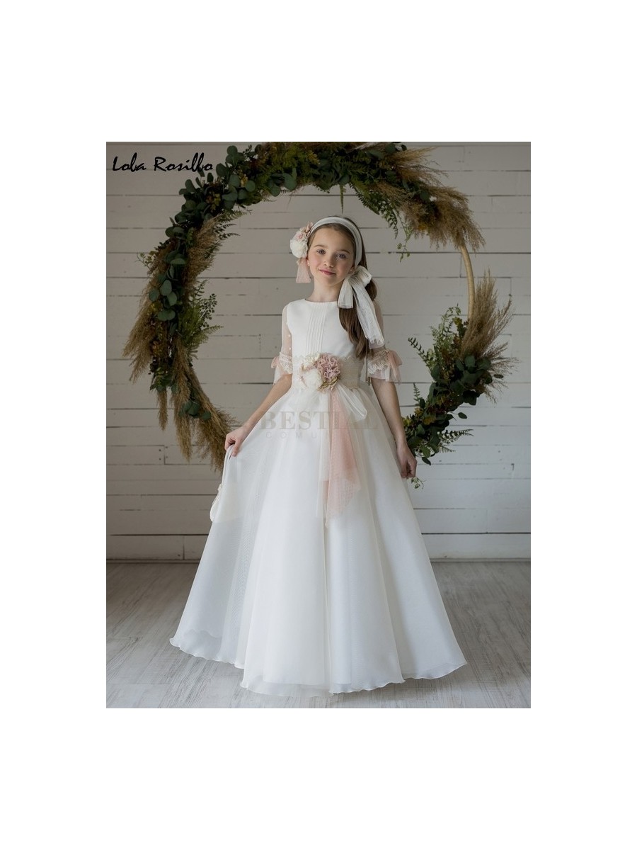Vestido de Comuniòn Lola Rosillo Q429 Vestido Lola Rosillo de manga francesa trabajado en organza. El cuerpo se aprecia unas lineas verticales limpias y sencillas que acompañan a las mangas elaboradas en una semitrasparencia en plumeti y rematadas con dos volantes y un lazo en tul rosa. La falda tiene una preciosa caida ya que va trabajada en organza lo cual realza un efecto vaporoso y ligero al vestido. Este vestido lleva un precioso tocado de comuniòn a juego del fajin el cual se vende por separado.